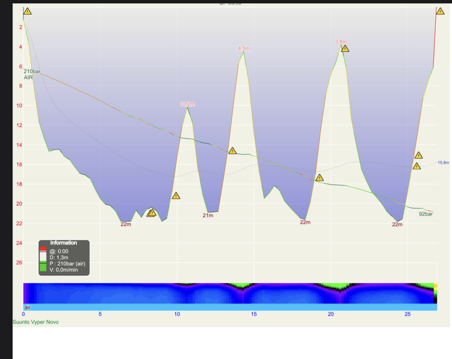 Ce jour-là, mon fils âgé de 16 ans prépare son niveau 2, il fait des remontées assistées. Il en fera 4 entre 3m et 22m, pour une durée totale de 27 min de plongée.